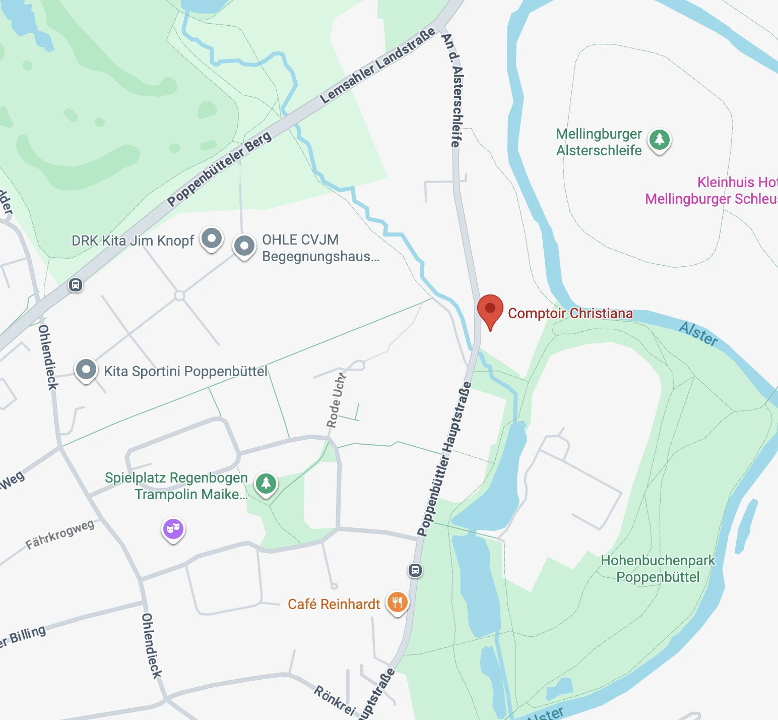 Unser Lokal liegt an der Alsterschleife 2, im ruhigeren Teil von Poppenbüttel — Parkplätze in der Umgebung, Einstieg zum Wanderweg keine zwei Minuten weg.