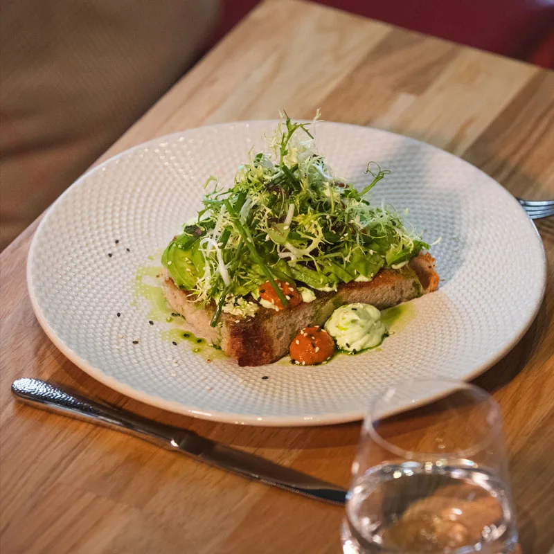 Shakshuka (11 €) ist Tomaten-Paprika-Ragout mit Ei und frischen Kräutern, dazu Sauerteigbrot. Wer es etwas eleganter mag: das Rindertatar in zwei Größen (14 € für 80 g, 19 € für 120 g) mit gebeiztem Eigelb, Schalotten, Kapern und Tatarmayonnaise. Ist abends ein Klassiker bei uns — morgens funktioniert es genauso.